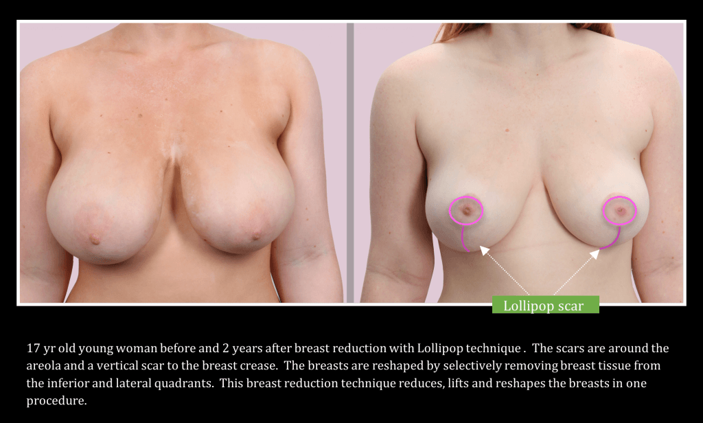 While all breast reduction techniques reduce breast size, the new “lollipop” technique, so-called because of the lollipop shape of the scar, reduces the breast with a much smaller scar, a better breast shape, and a shorter recovery. Creating the most “normal” breast requires a smaller size, a natural shape, and the least noticeable scars.