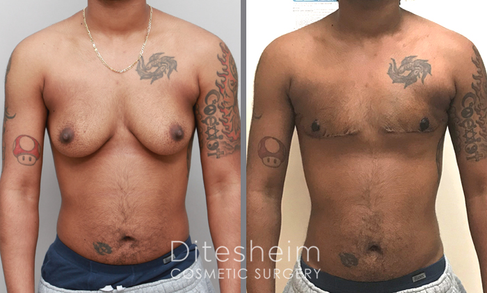 An alternative procedure is the Keyhole TOP surgery. Using a double incision approach, the nipple is not detached. Rather the nipple remains attached to a thin layer of breast tissue for its blood supply and is literally slid up the chest without being detached. (second pt above and pt below) The scars are placed at the inferior border of the chest muscle to define the masculine chest shape. The scar may continue under the arm is there is fatty tissue or excess skin under the arm laterally. Alternatively, if there is no fullness under the arm, the scar can be hidden in the shadow under the lateral chest muscle.