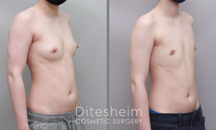 During the transfeminine top surgery, Dr. Ditesheim will construct breasts with silicone or saline implants, like traditional breast augmentation operations. In some cases, patients may choose to create and enhance their breasts with fat transfers for results more similar to natural breast tissue.