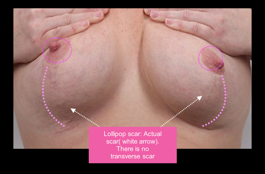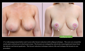 While all breast reduction techniques reduce breast size, the new “lollipop” technique, so called because of the lollipop shape of the scar, reduces the breast with a much smaller scar, a better breast shape and a shorter recovery. Creating the most “normal” breast requires a smaller size, a natural shape and the least noticeable scars.
