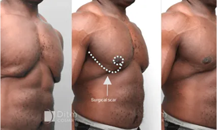 • Repositioning: When the upper chest skin (skin above the nipple) has sagged significantly, the nipple-areola complex is elevated, improving the overall appearance of the chest.
